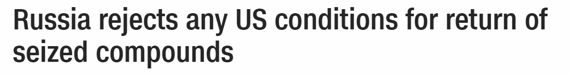 【俄要求美国无条件归还被没收的使馆府邸】克里姆林宫发言人周一向CNN表示,俄方拒绝美方基于归还俄使馆府邸而提出的任何条件。俄称美开出的任何条件都是“不可接受的”,被没收的使馆财物应该无条件还于俄方。该发言人还表示,自汉堡G20峰会上普京总统向特朗普主动提起归还俄使馆财物之后,双方一直在就此事保持接触。