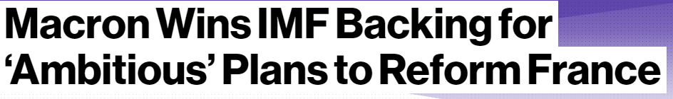 【马克龙的“改革计划”赢得国际货币基金组织支持】国际货币基金组织(IMF)代表团团长Christian Mumssen周一在巴黎对媒体说,马克龙总统早前提出的“改革计划”令人印象深刻,并认为现在是实行这个雄心勃勃、全面的改革计划的好时机。马克龙早前提出了包括裁减议员席位减少开支、禁售燃油车推行绿色能源等多项措施在内的改革计划。