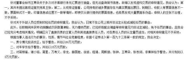 对于王寒朵的申辩意见,证监会并不认可,证监会认为,从现有证据看,博元投资持有的诸多票据存在与真实票据出票日、到期日、收款人等票面信息不一致,票面样式不一致,印章信息或位置不一致等情形。即使仅从银行提供的票面信息,也极易发现大量票据系伪造。申辩人的主张不合理,不予采纳。