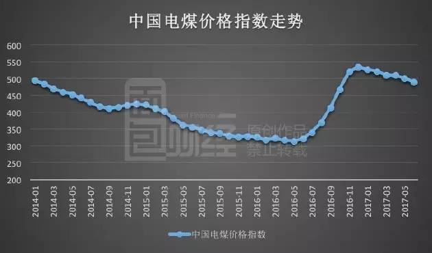 据国家发改委数据,2017年6月中国电煤价格指数为490.91,与上年底相比,下跌8.23%;电煤价格指数已连续6个月出现回落。下图为面包财经根据国家发改委数据绘制的中国电煤价格指数走势: