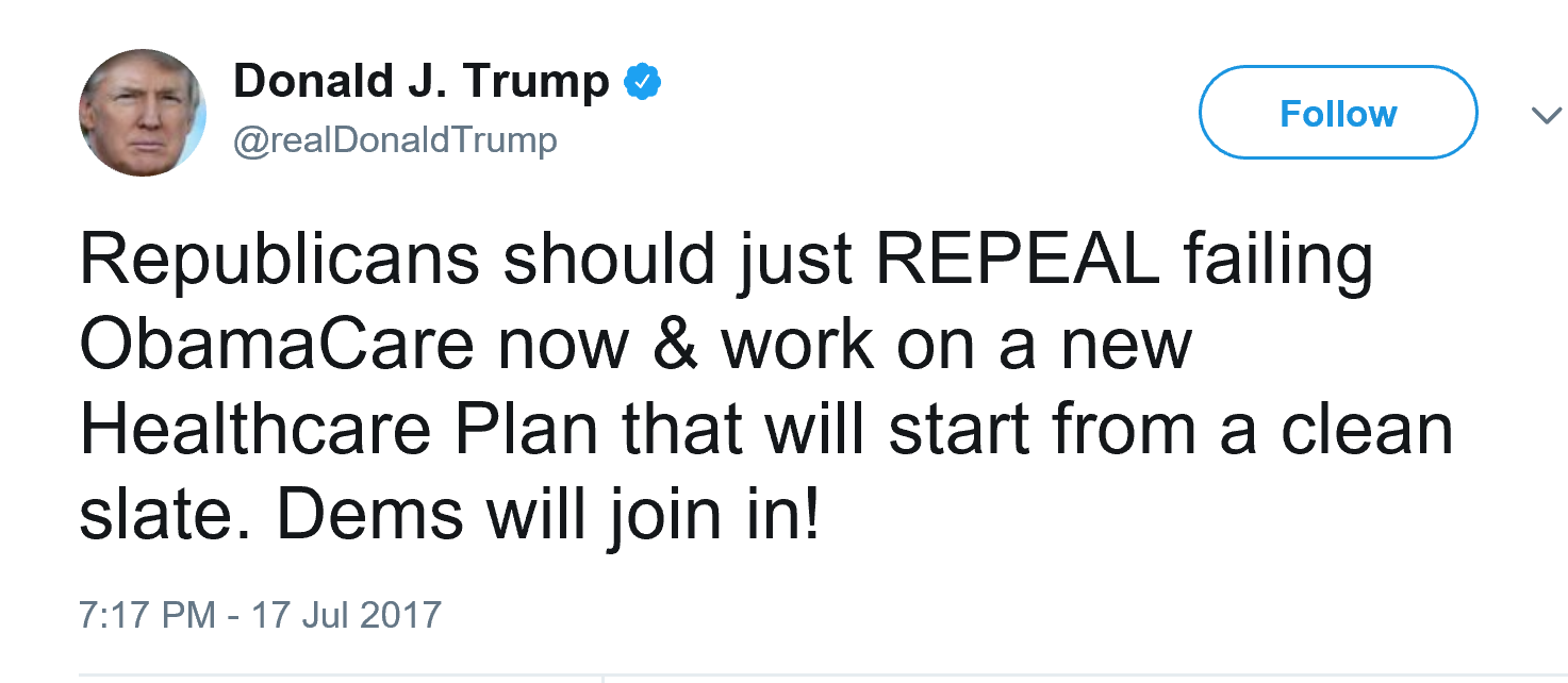 特朗普在周一晚间的推特中也呼吁共和党直接废除奥巴马医保,一切从零开始。