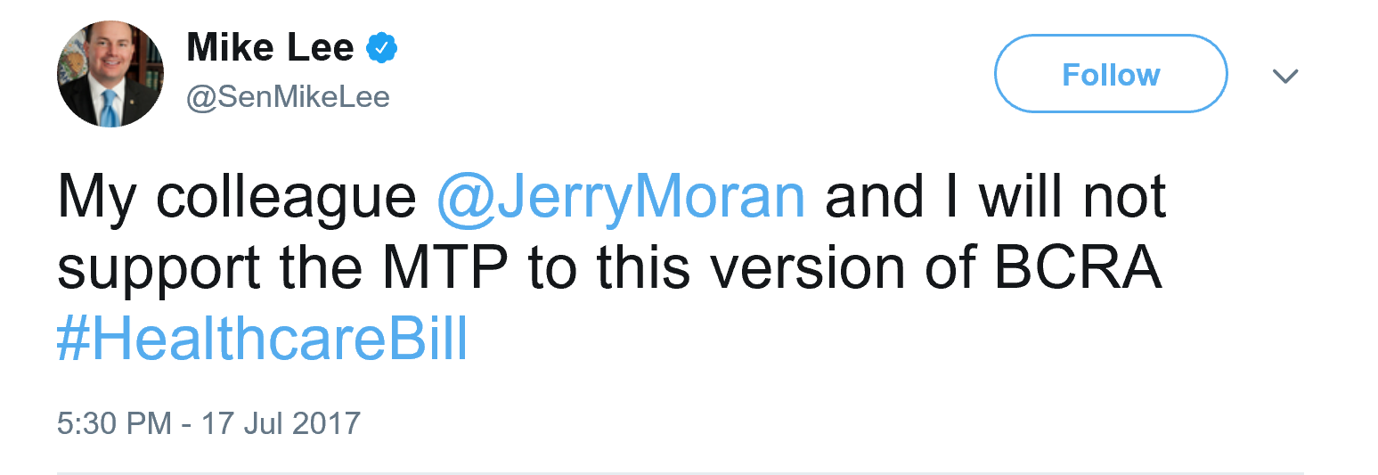 来自犹他州的参议员李(Mike Lee)和堪萨斯州参议员莫兰(Jerry Moran)周一晚间宣布将反对共和党的医保法案取代奥巴马医保。此前来自肯塔基州的参议员保罗(Rand Paul)和缅因州参议员柯林斯(Susan Collins)已经宣布他们不会支持开启推翻奥巴马医保的辩论。