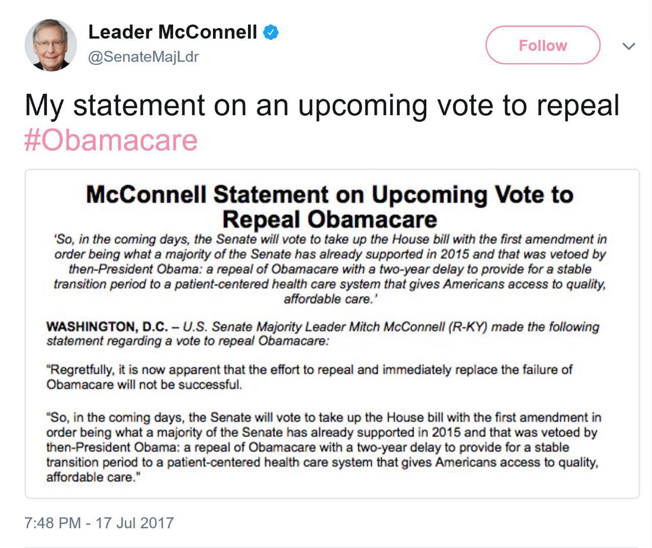 美国当地时间周一(7月17日)晚间,参议院多数党领袖麦康奈尔(Mitch McConnell)宣布共和党放弃使用新医保法案来立刻取代奥巴马医保,接下来的计划是先投票废除奥巴马医保,并在两年缓冲时间内继续研究出台新医保法案。