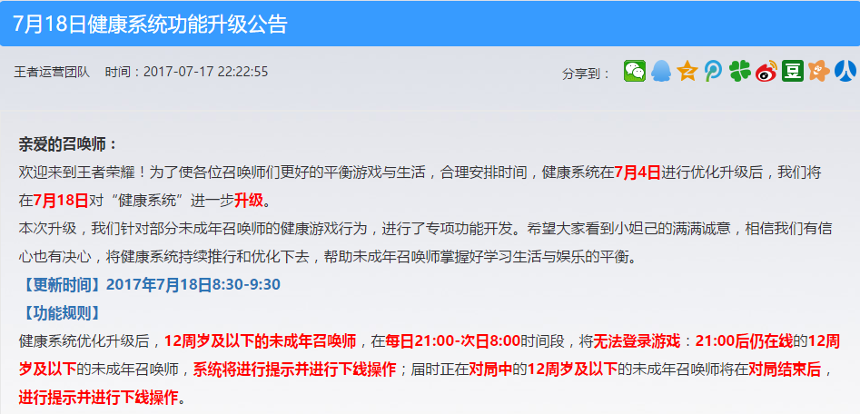 7月18日,《王者荣耀》对全服进行不停机更新。本次更新除了英雄平衡性调整和上线全新英雄“铠”,还将对“健康系统”进一步升级。其中,健康系统优化升级后,12周岁及以下的未成年召唤师,在每日21:00-次日8:00时间段,将无法登录游戏。
