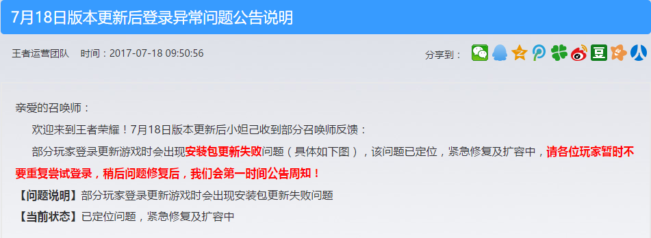 目前,《王者荣耀》官方表示已经收到了问题反馈,并且定位了问题,正在紧急修复及扩容中。
