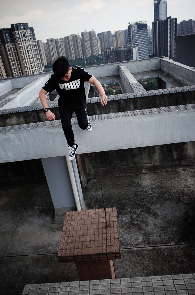 “我不混这些团队,我不是很喜欢太商业的……比赛我也不太参加,因为没必要那么拼嘛,超出自己动作范围,但是平时自己私下又喜欢。而且比赛其实会限制你,越比就越想比,失去跑酷本身的意义。”