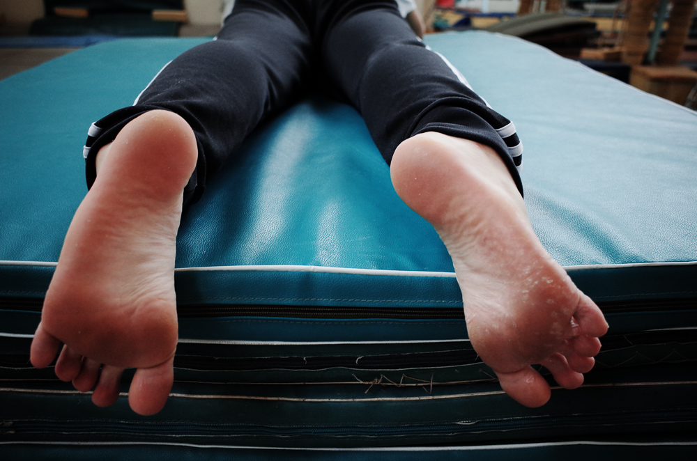 激烈的训练动作致使陈泽宇的脚上随处可见茧子与水泡