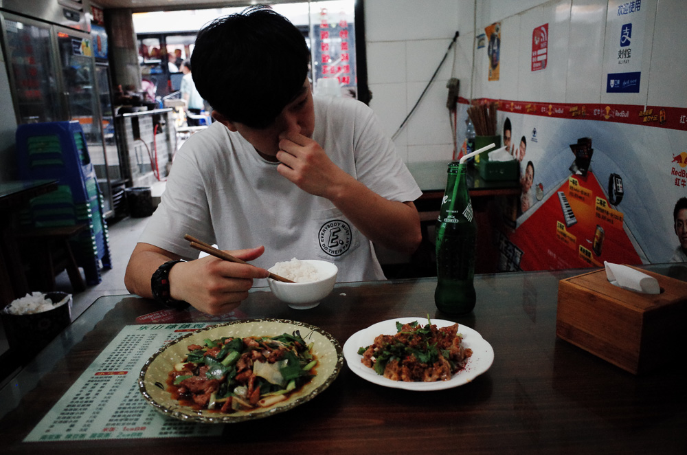 下午一点半,工作人员手拿条帚准备打扫,跑酷爱好者们看见条帚即明白,训练结束了。小伙子们陆续收拾好东西,快步走出体育馆,“错峰”去吃午饭。在附近的苍蝇馆子,陈泽宇点了盐煎肉和粉蒸牛肉。