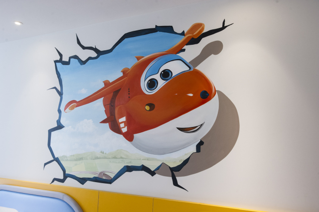 客房内还有一个亮点,就是挂在墙壁上的卡通形象3D画,王健民表示,这些是专业画师在房间现场手绘而成,立体效果很好,小朋友非常喜欢。“现在大部分客房都已经挂上了手绘的3D画,全部客房完成,还要看画师的时间。”