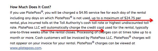 一旦选择了PlatePass服务,租车公司将每天收取4.95美金的服务费,包括在未使用PlatePass的用车时间,每月最多收取24.75美元服务费(不包括实际过路过桥费)。 PlatePass将会直接从租车的信用卡扣款,并且收费将不会呈现在租车发票上,他们往往也不会告诉你。