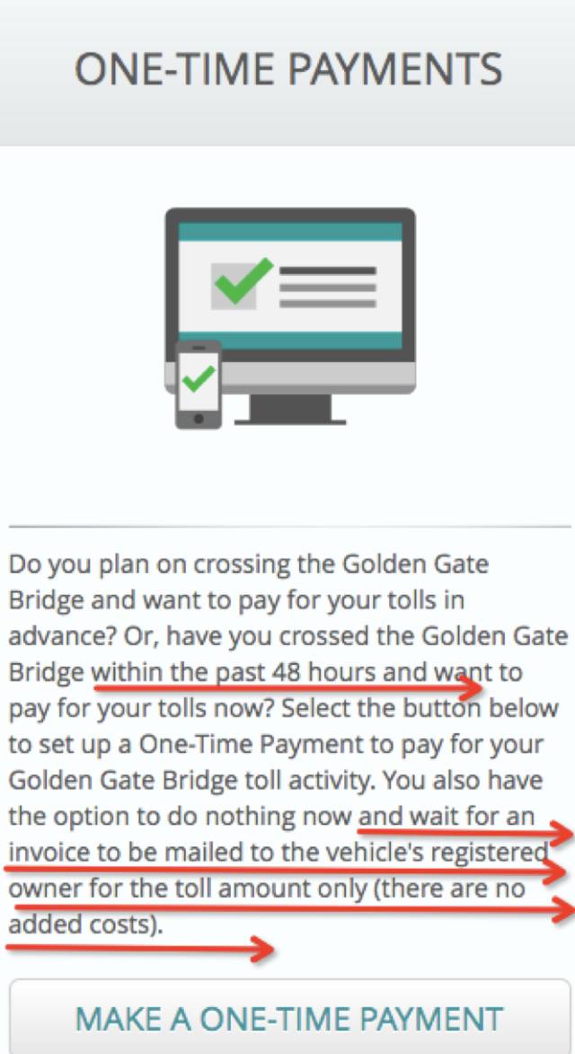 如果遇到金门大桥这样的Toll Road,在没有Fastrak的情况下,也不用着急。都可以采取一次性缴费的方式(ONE-TIME PAYMENT),这是一个短期账户,可以为在金门大桥上一次过桥或多次过桥付费。