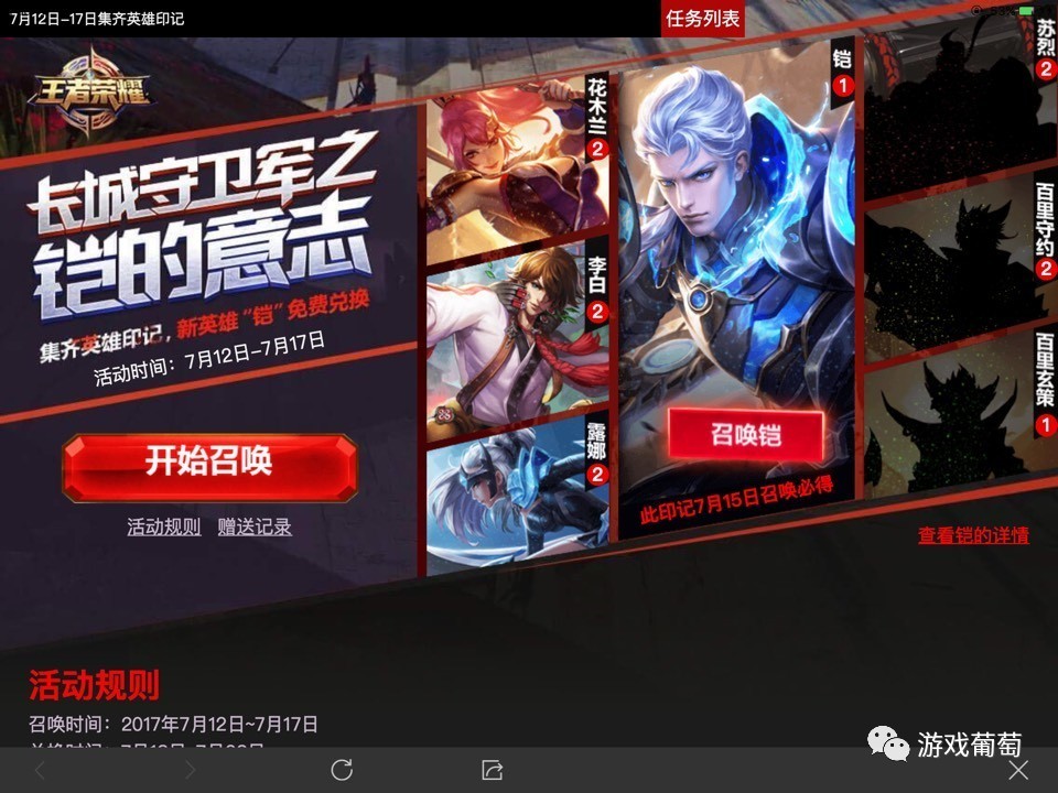 简单来说,由于游戏开启了新英雄印记收集活动,玩家只要集齐全部7张印记,即可兑换新英雄“铠”。当重复抽到同一类印记时,玩家可以把多余的资源分享到微信、QQ群,赠送给好友。