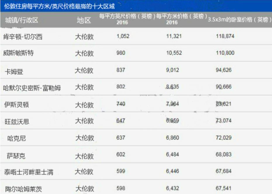 在伦敦市中心买房对于20岁左右的年轻人来说是一件不可能的事,除非你是年轻有为的银行家或有足够的个人积蓄。伦敦是英国房价最高的城市,黄金区域住宅每平米单价在10万到30万人民币之间。肯辛顿和切尔西是全英国均价最高的地区,其单位面积的价格高达11321英镑,相当于每平米10万人民币,其他地区每平方米均价都超过5,000英镑(4.4万人民币)。