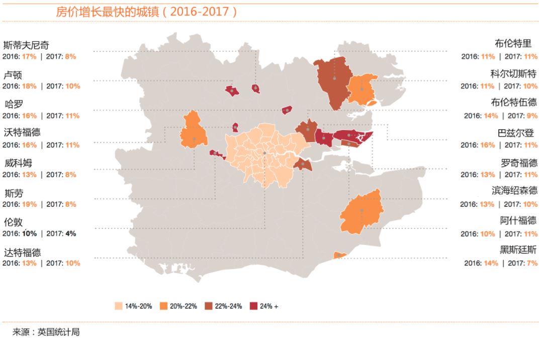 哪晓得,随着越来越多的人涌入这些城镇,这些地区的房价也水涨船高。普华永道对“通勤镇”的房价涨幅进行了分析,并发现尽管通勤城镇房价较低,但比伦敦市中心房产的涨幅更大。