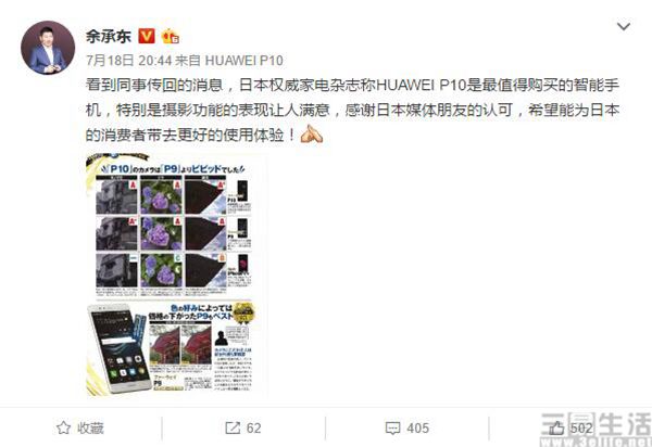 昨天晚上,华为消费者BG CEO余承东发微博称,日本权威家电杂志将HUAWEI P10评为最值得购买的智能手机,特别是摄影功能的表现让人满意,这一点让人非常意外,毕竟日本作为世界领先的相机市场,消费者对于拍照的要求还是很高的。具体的测试环节中,该日本杂志使用华为P10、P9和iPhone 7 Plus对比,结果P10、P9完爆iPhone 7 Plus,P10在逆光表现还要优于P9。
