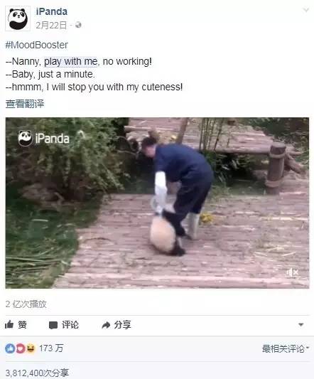 今年2月, iPanda熊猫频道在微博发布了熊猫“奇一”狂抱饲养员腿不放的视频,转发量迅速破10万,不少网友纷纷留言求同款腿部挂件。