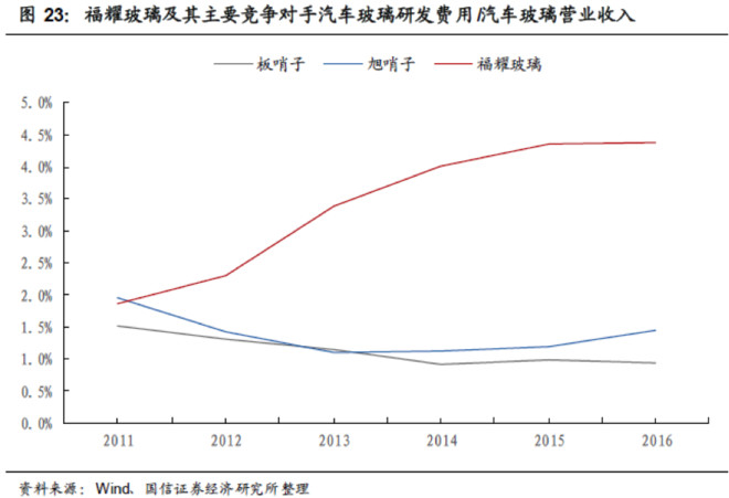 此外,福耀玻璃研发费用占比逐年增加。2016 年,福耀玻璃研发费用为72.8 亿元,同比增加22.72%,占公司汽车玻璃营业收入比例由2011 年的1.86%上升到2016年的4.38%,提升近1.5 倍。而主要竞争对手板哨子和旭哨子汽车玻璃研发费用占汽车玻璃业务收入比例不到1.5%。