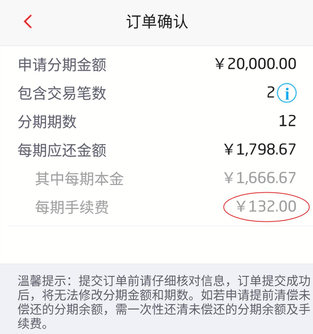 乍一看,这个分期订单没什么问题,但是大家有没有发现每期手续费都是固定的132元。先做个对比,大家能够更直观的感受到。