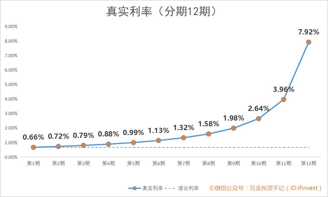 从上面的图可以看出,第一期的真实利率确实为0.66%,但是随着时间的延长而增加,到了第十二期真实利率已经高达7.92%,相当于年化利率95.04%。