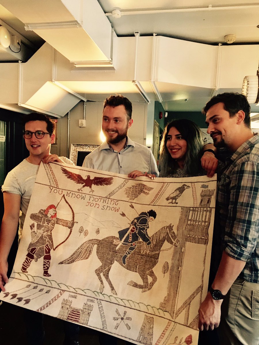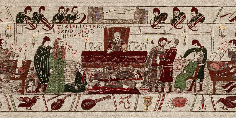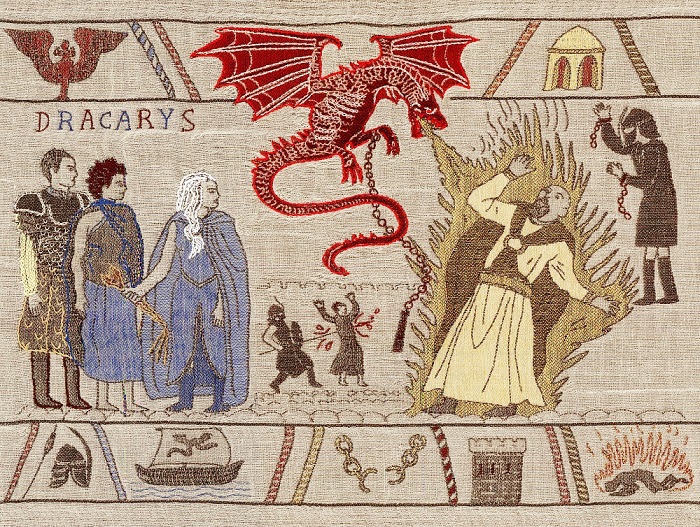 用挂毯叙述历史或神话,是一种在全世界众多民族中通行的古老艺术形式。这条《权力的游戏》挂毯的灵感来源于11世纪的《贝叶挂毯》。这条挂毯原长70米,现存62米,用70多个场面记录了黑斯廷战役,被认为可能是人类历史上最长的连环画。