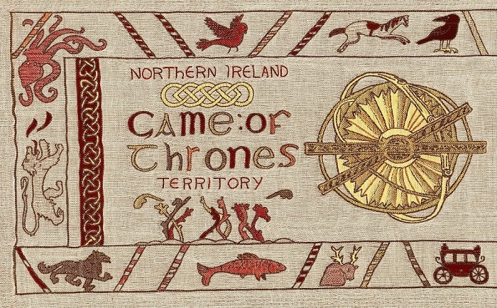 广告商们又怎么可能放过借着《权力的游戏》蹭热度的机会?最近,爱尔兰旅游局和广告公司伦敦阳狮一起,把权力的游戏前六季的故事绣上了一条挂毯。六季的故事当然不短,于是这条挂毯长达250英尺(约76米),而挂毯上则绣上了权力的游戏里的众多重要场景。