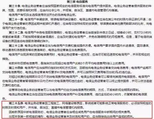 但是,我们还可能会遇到已经付费但由于运营商自身的原因造成的网络服务中断的情况,在这种情况下,除了看到有些运营商会对网络中断服务的故障作出事先预告、报备及事后有关原因的说明之外,很少见到有运营商因为并不是由于不可抗力的原因造成的网络中断服务而主动对用户进行适当补偿的行为。根据2016年2月6日修订的《中华人民共和国电信条例》第三章第35条的规定: