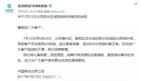 2017年7月12日,通州区、朝阳区及东城区部分区域因4G网络升级造成网络中断,持续时间约45分钟,对于早班出行的人员使用共享单车等造成了不便。