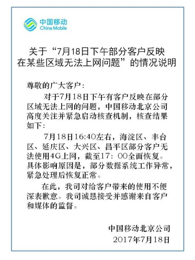 2017年7月18日,海淀区、丰台区、延庆区、大兴区、昌平区部分用户出现网络中断服务情况,有部分数据系统工作异常原因造成的,持续时间约20分钟。