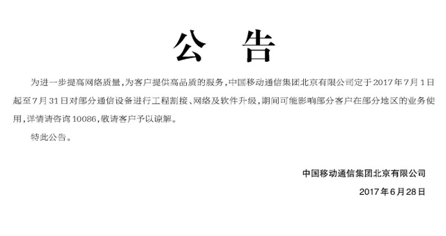 北京移动在部分区域的网络服务故障持续的时间都不长,而从故障原因来看,都属于常规运营原因,不存在不可抗力的事件影响。而针对这种情况,根据北京移动官方微博在2017年7月12日对故障说明的同时,另外贴图证明其在2017年6月28日发出了公告,公告称2017年7月1日起至7月31日对部分通信设备进行工程割接、网络及软件升级,期间会影响部分客户在部分地区的业务使用。