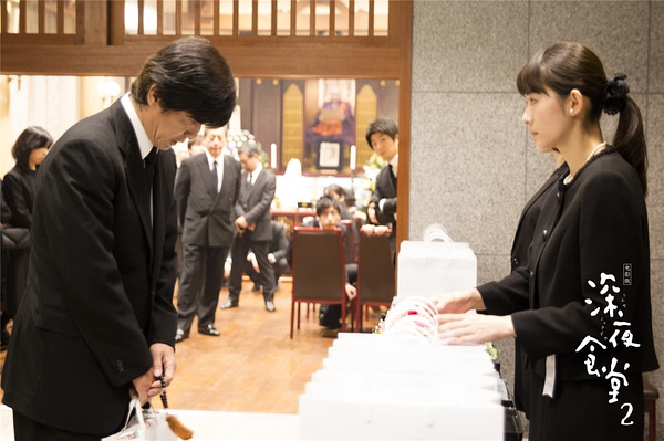 《深夜食堂2》在处理方式和剧情上沿袭了上一部,三个故事算是松松散散的围绕住了“死亡”这一主题。第一个故事的女主角在压力大时就喜欢穿上丧服出去走走,但只有每次穿上丧服之后才有人搭讪示好,这让她陷入了自我认识的困境,某天真的在葬礼上认识一位男士,以为宿命被打破结果对方是个偷祭祀品并欺骗伤心女子的惯犯。