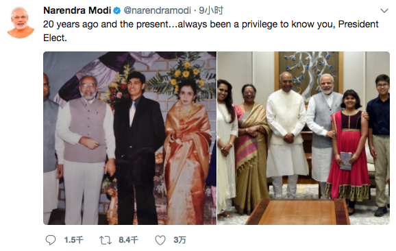 周四,莫迪也在推特上表达了对考文德的祝贺,还贴出了一张两人年轻时的合照。
