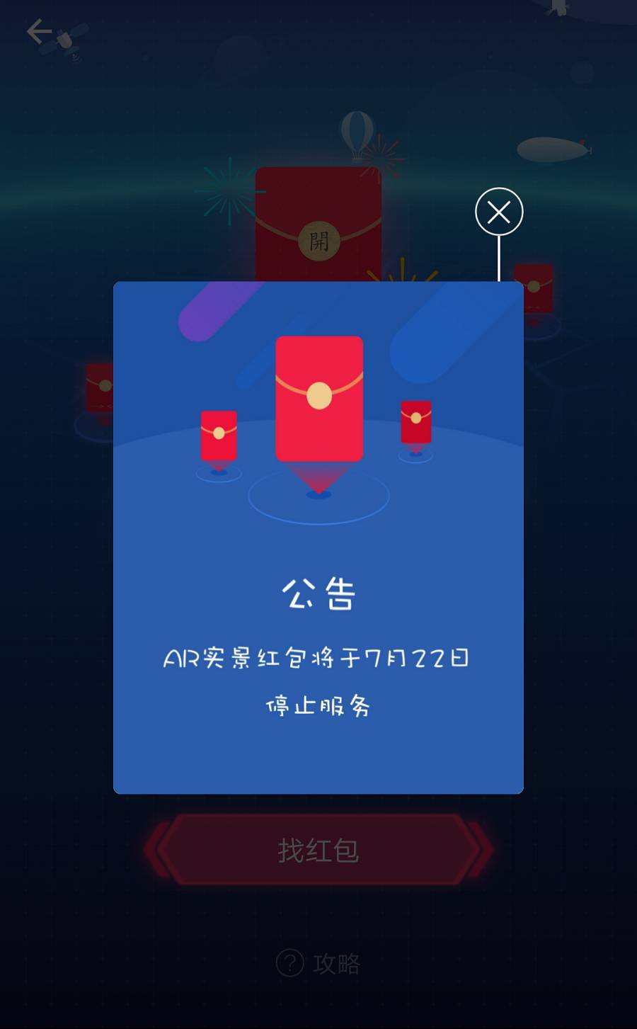打开支付宝的红包界面,进入到AR红包,可以看到官方发出的公告,“AR实景红包将于7月22日停止服务。”简简单单一句话,让昔日的“网红”瞬间跌到了谷底。