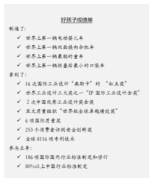 至今,好孩子已经获得8116项国内外专利,比竞争对手前十名的总和还多。它还先后两次问鼎中国优秀工业设计奖金奖,16次获得红点设计奖,并折桂红点至尊奖、iF金奖。