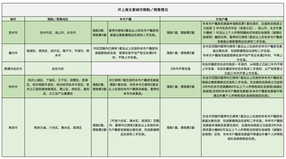 首先,在上海已经被限购的,倒是可以考虑去周边城市置业。但是这两年来,上海周边的城市也都相继出台了相应的限购/限售政策来管理房地产市场。在去周边置业时可以先参考一下上海周边主要城市的限购/限售情况,综合考量(杭州和南京作为浙江省和江苏省省会以做参考)。