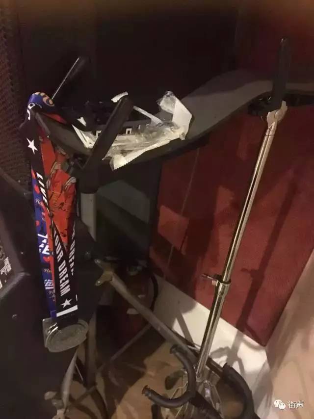 暖色灯光下堆着一人多高的乐器箱子,两台电风扇吱扭吱扭得摆着头,一张不大的办公桌,一架占地不小的健身器械,地上有几双球鞋。