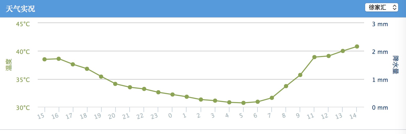 根据上海中心气象台的气象实况,7月21日上海市区徐家汇站最低温出现在凌晨5时,为30.7度,截至13时,徐家汇站的最高气温已突破40度,至下午14时仍在持续攀升。13时59分,徐家汇站气温升至40.9。
