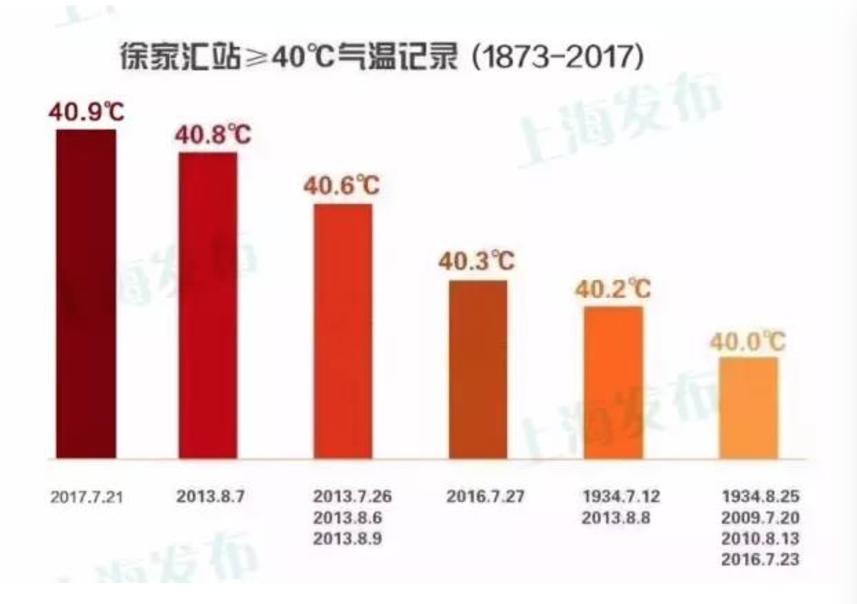 气象资料显示,徐家汇站自1873年有气象记录以来,曾在1934年、2009年、2010年、2013年和2016年出现过40度以上气温记录,其中以2013年8月7日40.8度为最。2017年7月21日的40.9度高温,打破了徐家汇站145年气象记录。