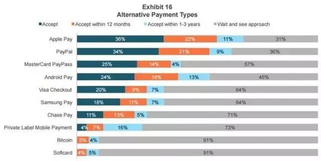 但是在国外,显然支付宝、微信没有这个基础,所以在出海战略上,并没有出现像国内这样风卷残云的势头。欧美用户对这种功能庞杂的APP并不感冒,同时,信用体系的完善,让NFC在推广上的成本没有那么高,Apple Pay反而做得有声有色。零售顾问公司Boston Retail Partners的数据显示,目前全美已有36%的商家开始支持Apple Pay,上年同期只有16%,已经成为美国移动支付市场的带头大哥。并且,Apple Pay全球交易量在去年第四季度同比增长了500%。与此同时,支付宝和微信在美国市场的存在感也不强。
