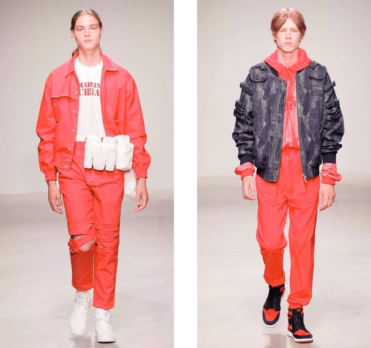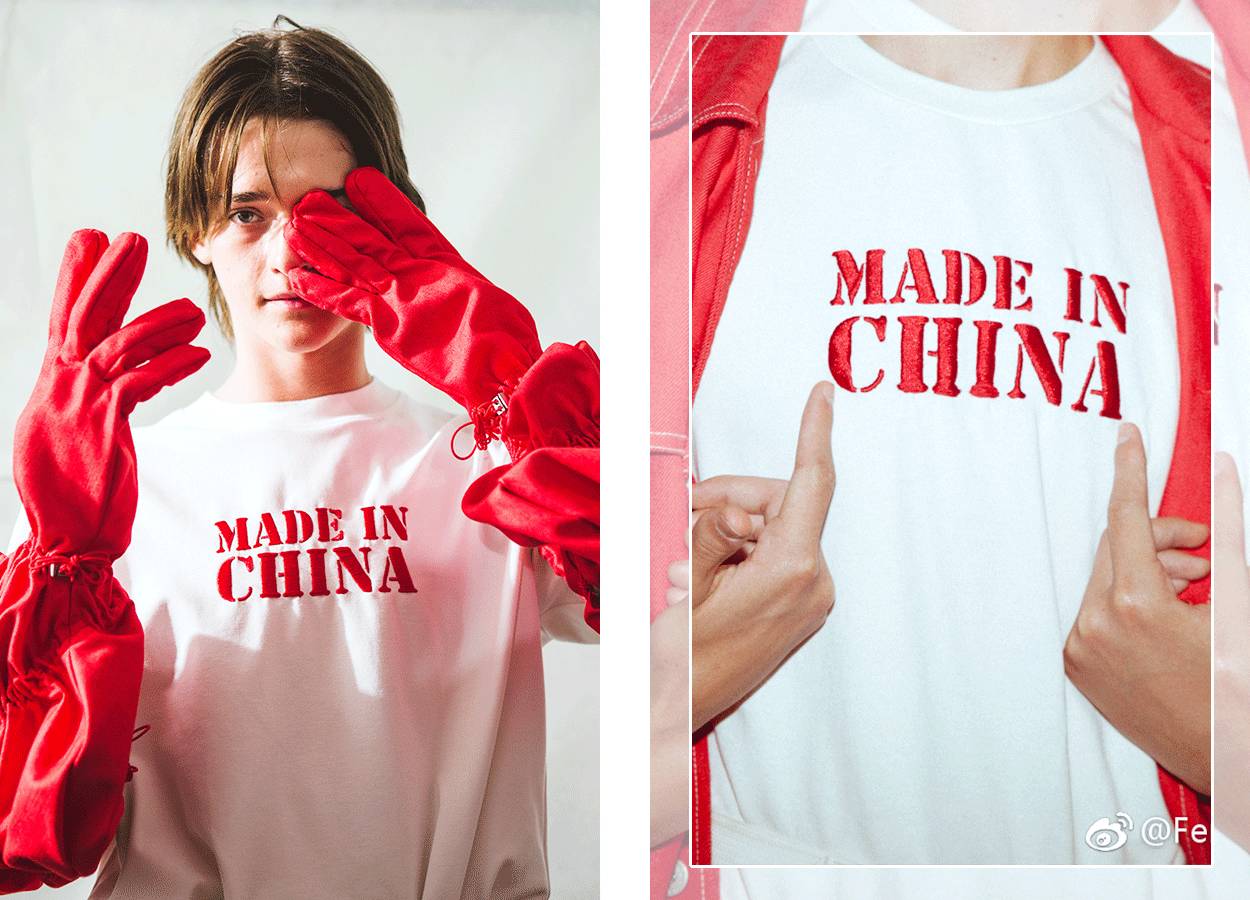 2018春夏系列,她又把在中国长大的体验加进来,搞了个“Made in China”,灵感来自中国乡村景色,有很多中国红,标志性的3D立体字。