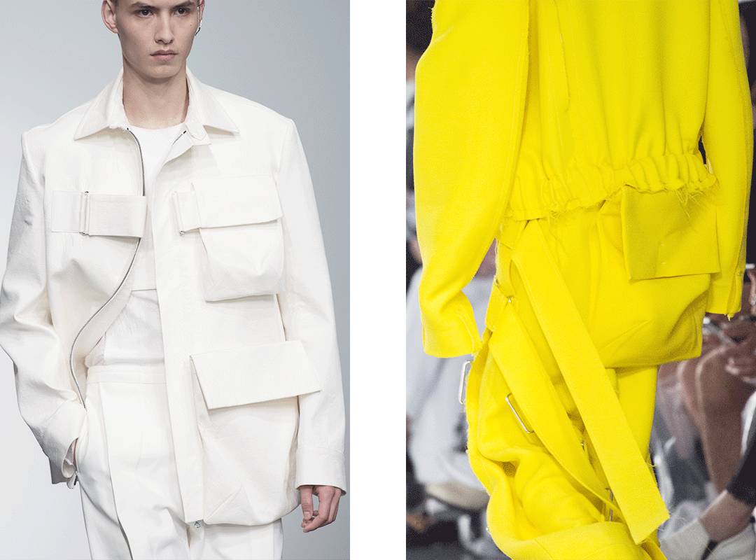 他们在单色调的衣服上弄了一些花样来增加层次,实现自然的阴影,比如不对称,飘带,上衣胸口的大口袋~