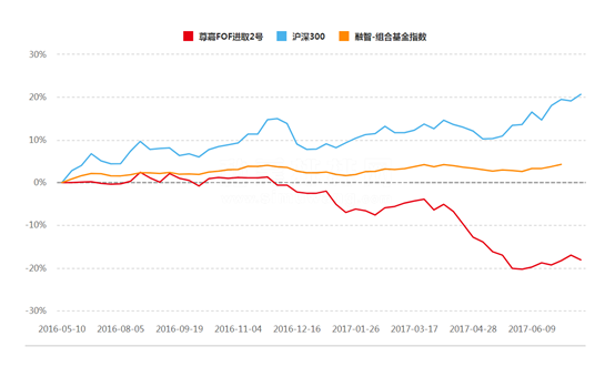 “尊嘉FOF进取2号基金”自2016年5月10日成立以后净值一直增长乏力。起初,该产品还基本能保持正收益状态,去年11月末以后,净值就处于亏损状态。今年4月7日至5月26日期间,该产品净值更是出现了一轮明显的下挫,跌幅为15.81%。近期,虽然净值出现了小幅反弹,但“尊嘉FOF进取2号基金”的累计亏损率依然高达18.10%。