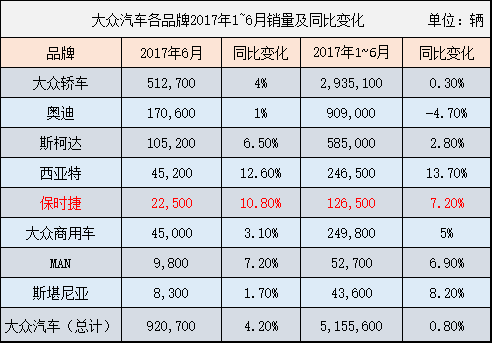2017年1~6月大众汽车旗下各个品牌销量及同比变化