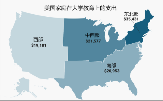 报告显示,在美国东北部,一个孩子上大学的费用高达35431美元,相当于西部家庭平均费用(19181美元)的两倍,而在中西部和南部的费用分别是21577美元和20953美元。