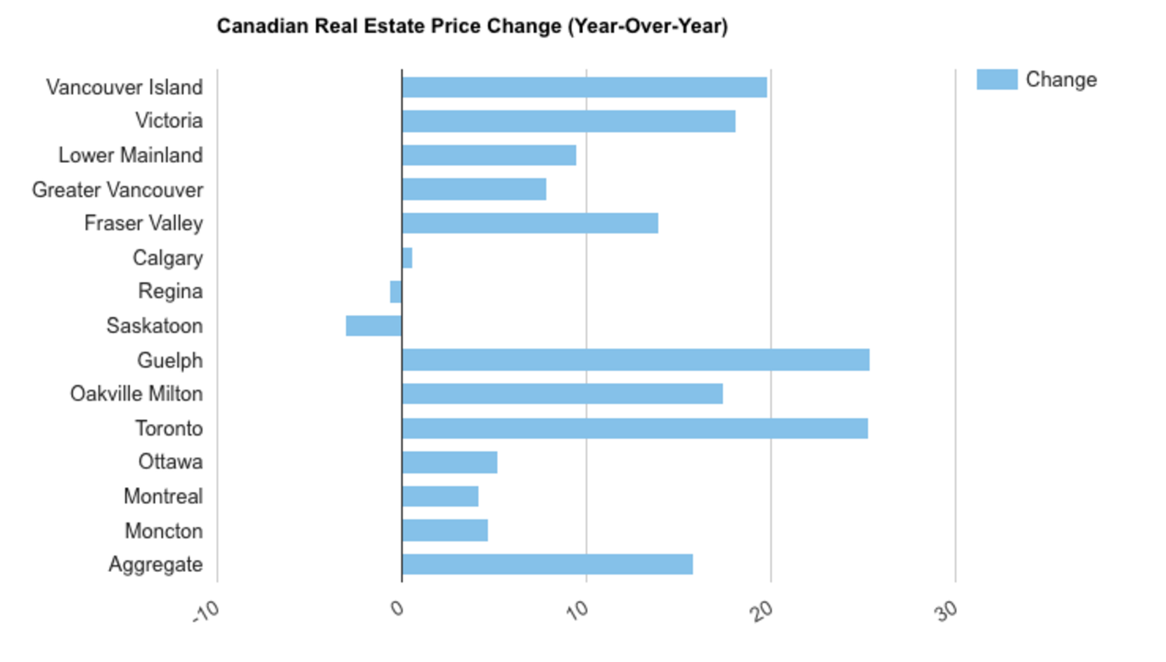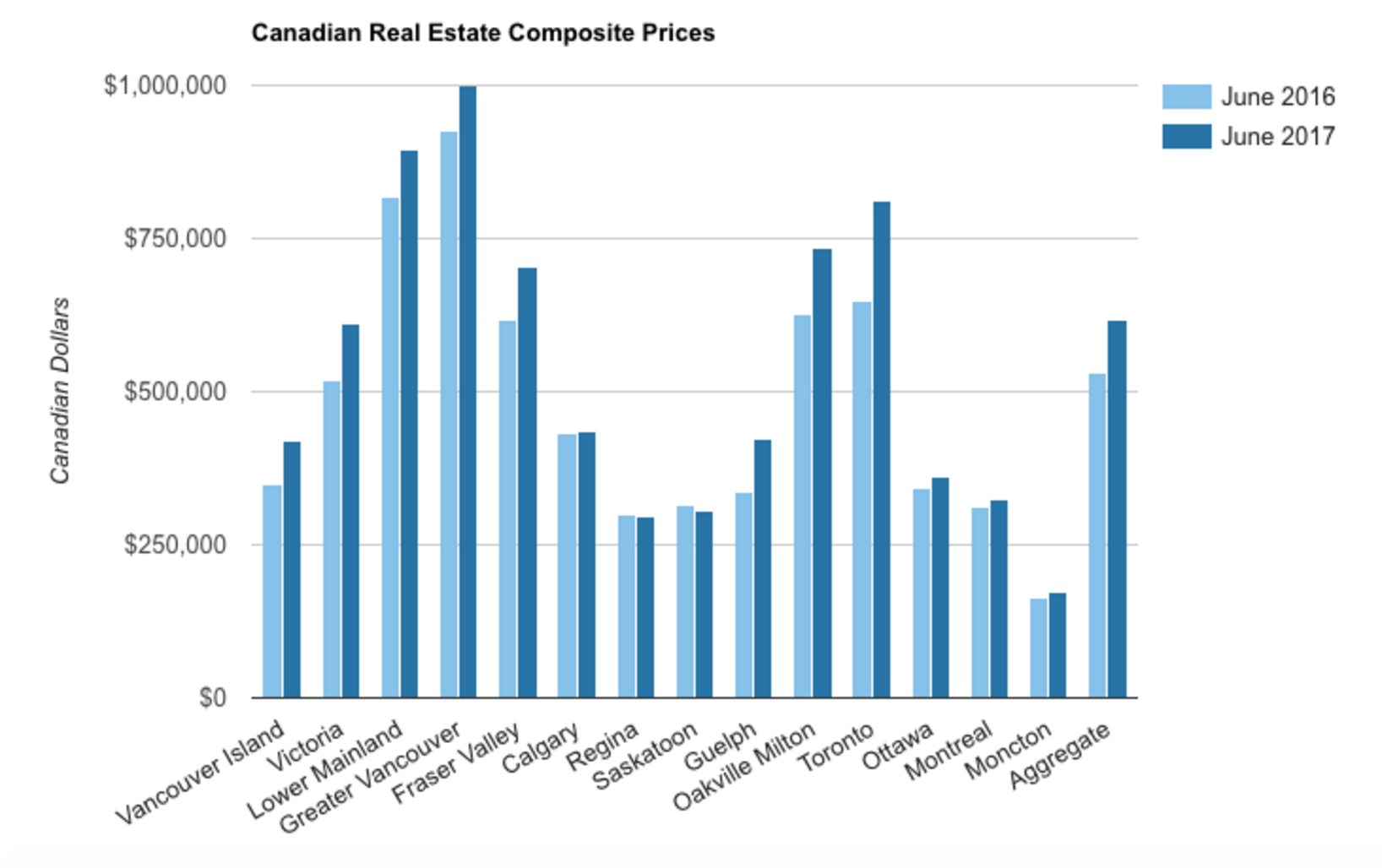 在加拿大境内,年度变化最大的城市为多伦多、格尔夫和温哥华岛(Toronto, Guelph, and Vancouver Island)。多伦多在6月结束时,综合基准价格为81.07万加元,较去年同期增长25.34%。多伦多郊区的圭尔夫则达到了421800加元的复合基准价格,也比去年同期上涨了25.34%。奇怪的是。第三个是温哥华岛(注意是温哥华岛,并不是温哥华),那里的基准价格为418,400美元,比去年同期上涨了19.81%。