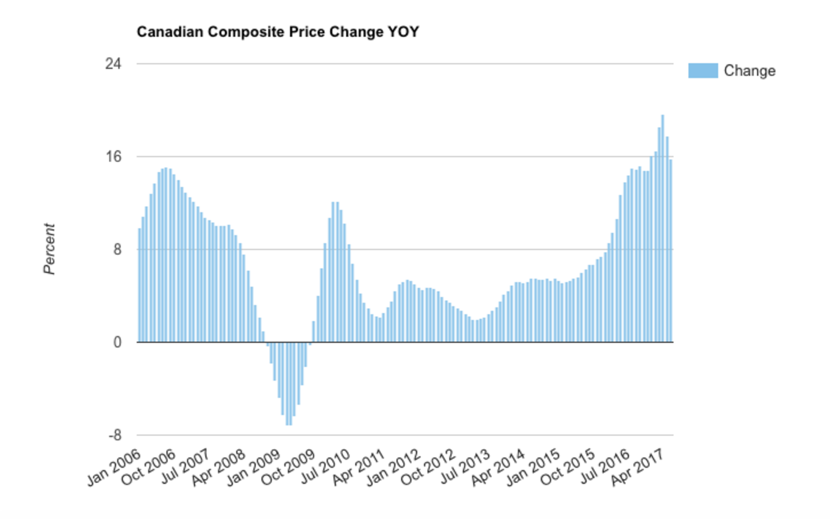 另一方面则是价格上涨的放缓。目前加拿大全国各地的房价基本持平于前一个月。如果你在加拿大购买一处普通的住宅,目前的价格是616500加元。这个数字虽然比去年同期增长了15.8%,但相比前一个月则下降了0.3%。虽然这仍然是一个相当不错的同比增长,但15.8%的增长意味着增长减速。