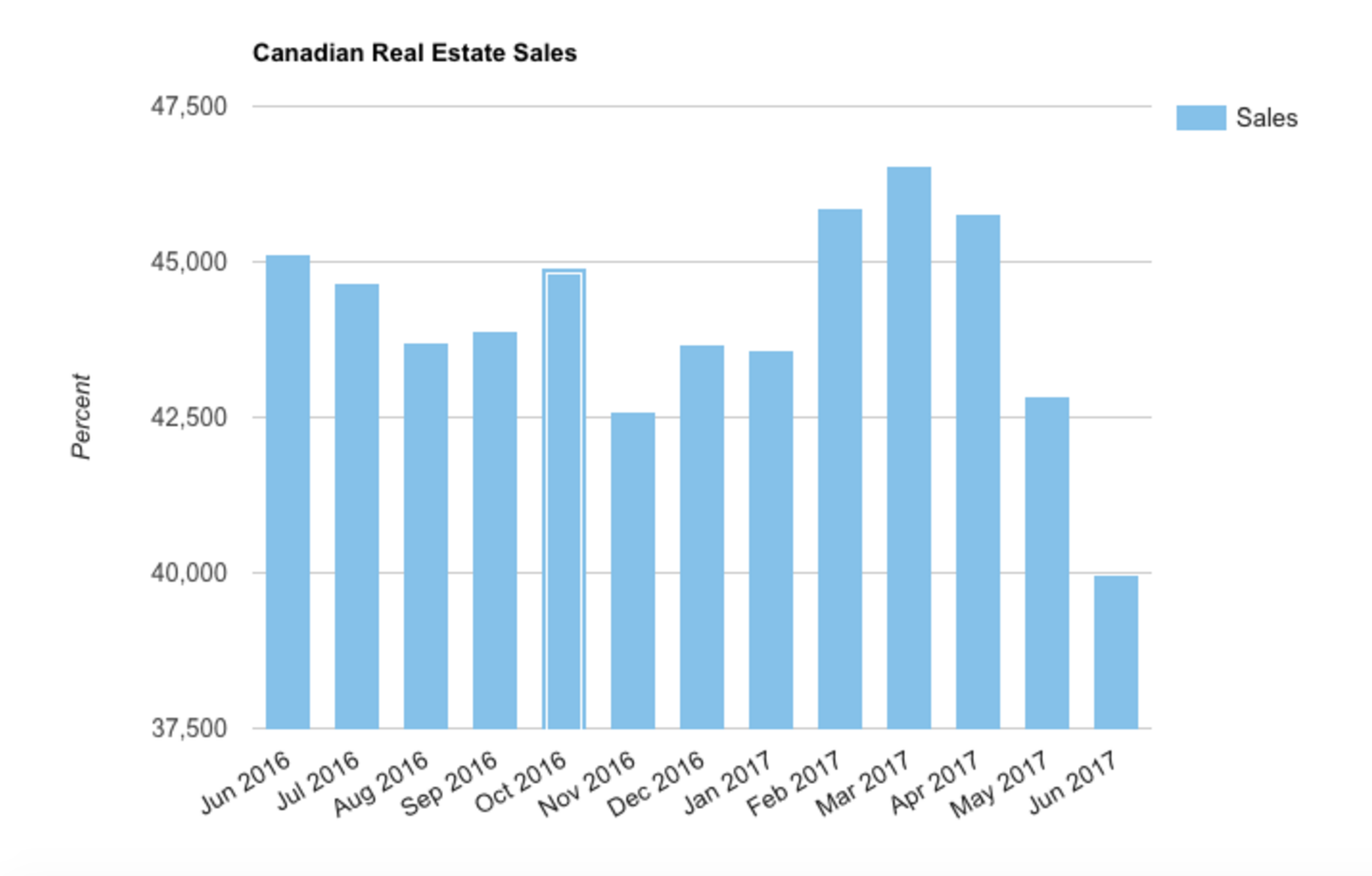 一方面是销量。最新数据显示,加拿大境内房产销售同比下降11.4%。加拿大各地的房地产销售都在剧烈下降。全年39,979个销售相比于往年同时段下降11.4%。如果我们着眼与月度下降比例则更加明显,数值达到6.7%,这是自2010年6月以来的最大月度降幅。本月的下降趋势是在预期内的,只是没有想到会是这么大的降幅。
