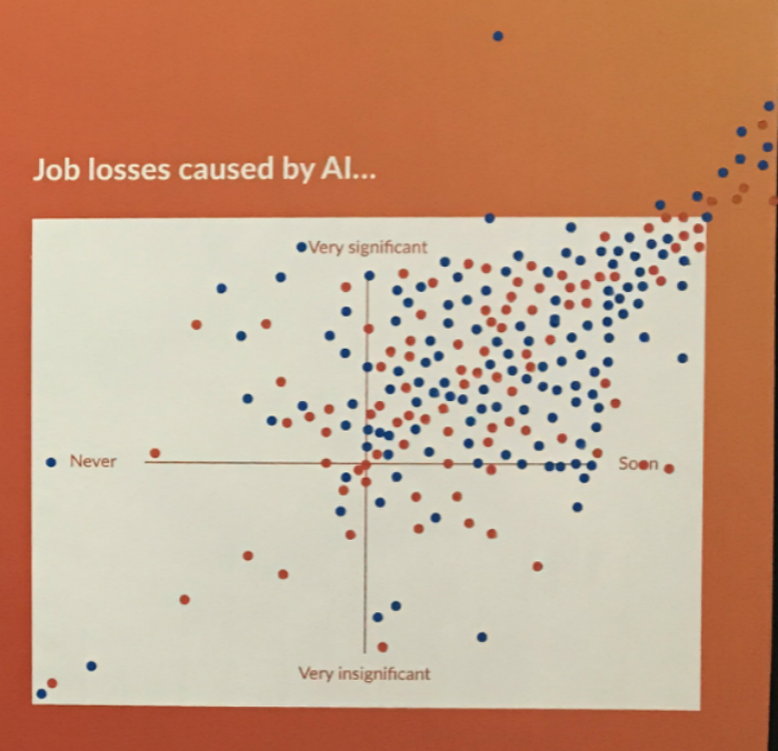 7月11日至13日,来自全球90个国家(地区)的14281名参会者来到香港参加了这一年度科技创业盛宴。一个引人瞩目的议题是“人工智能是否会夺走人类的工作”。几乎没有任何争议地,这个问题取得了现场投票观众的普遍共识:“是的,而且很快就会发生。”代表投票者立场的红蓝圆点密密麻麻地布满了“非常显著”和“很快”的象限内,甚至蔓延到了象限之外。可见的是,即使是正在促使这一切发生的科技行业圈内人,也对人工智能夺走人类工作的前景充满焦虑。