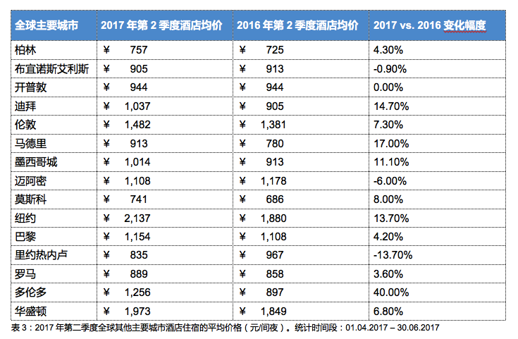 (注:价格统计范围为2017年4月1日至6月30日期间所有未取消的酒店预订,单人间和双人间,含早、未含早的1-5星级酒店均涵盖在内。)