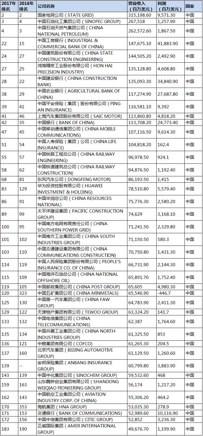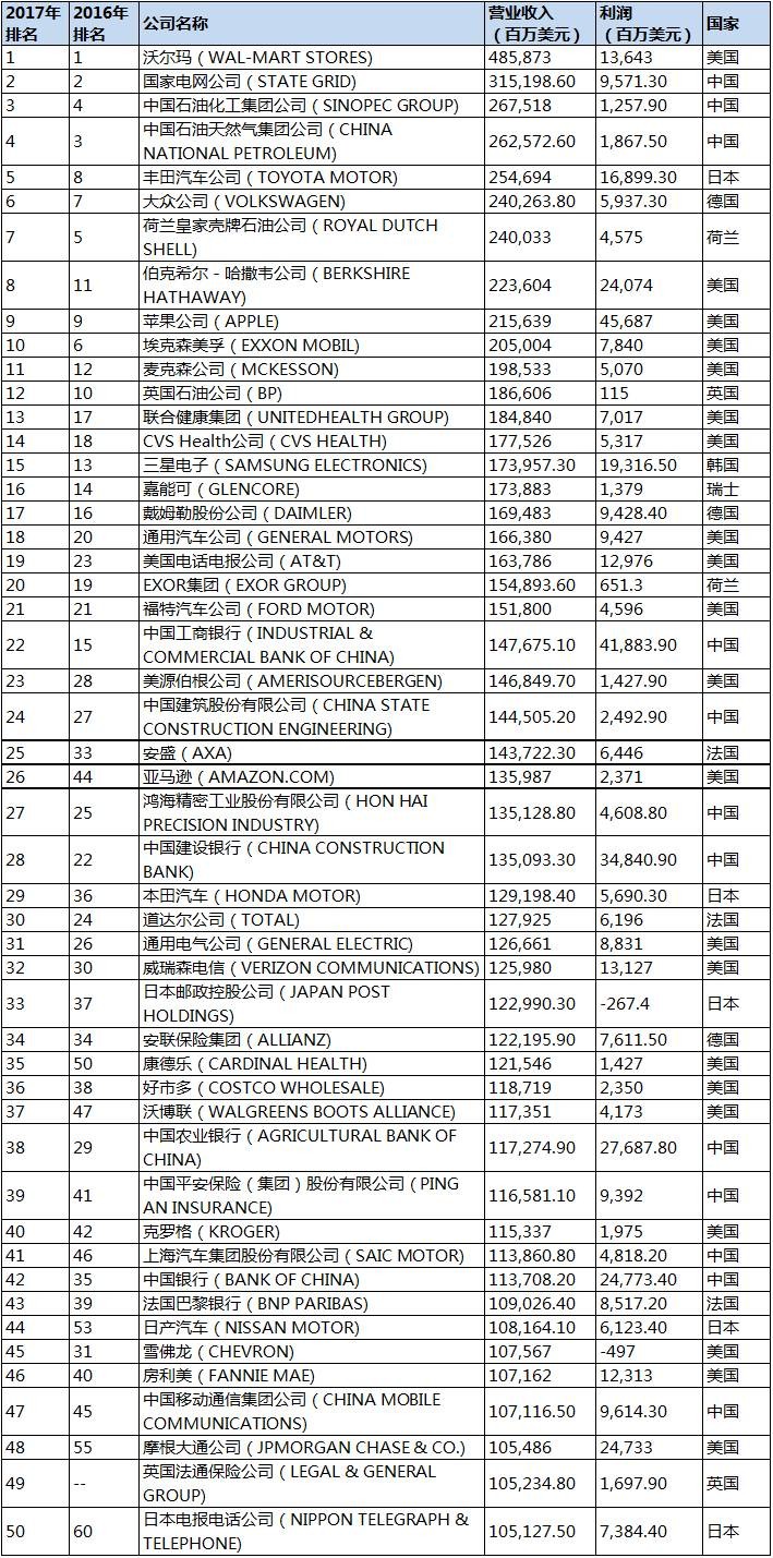 20日晚间,2017《财富》世界500强企业出炉。沃尔玛以485873百万美元的营业收入,连续四年霸居榜首,国家电网也继去年之后,以315198.6百万美元的营收再次位居排行榜第2,中石化和中石油分别排名第3和第4。