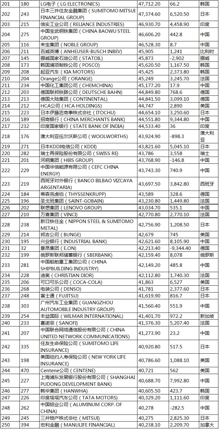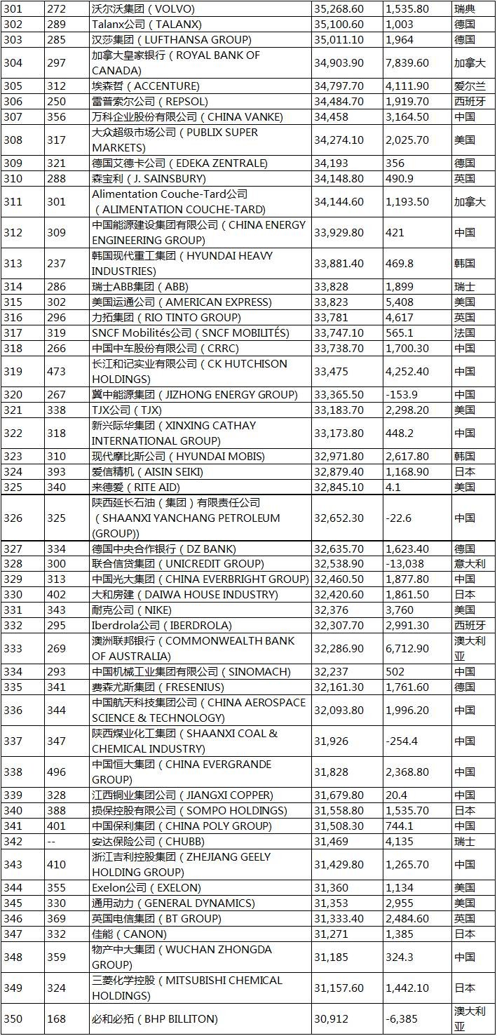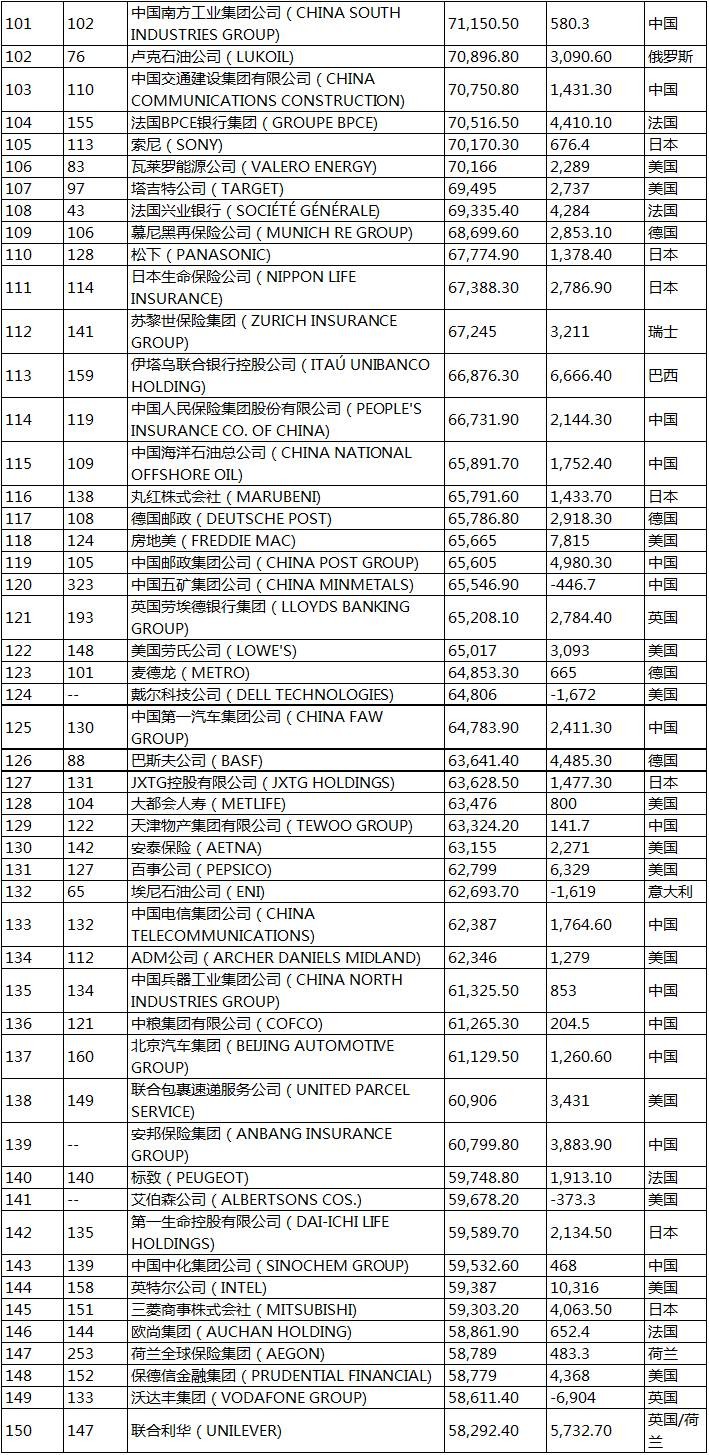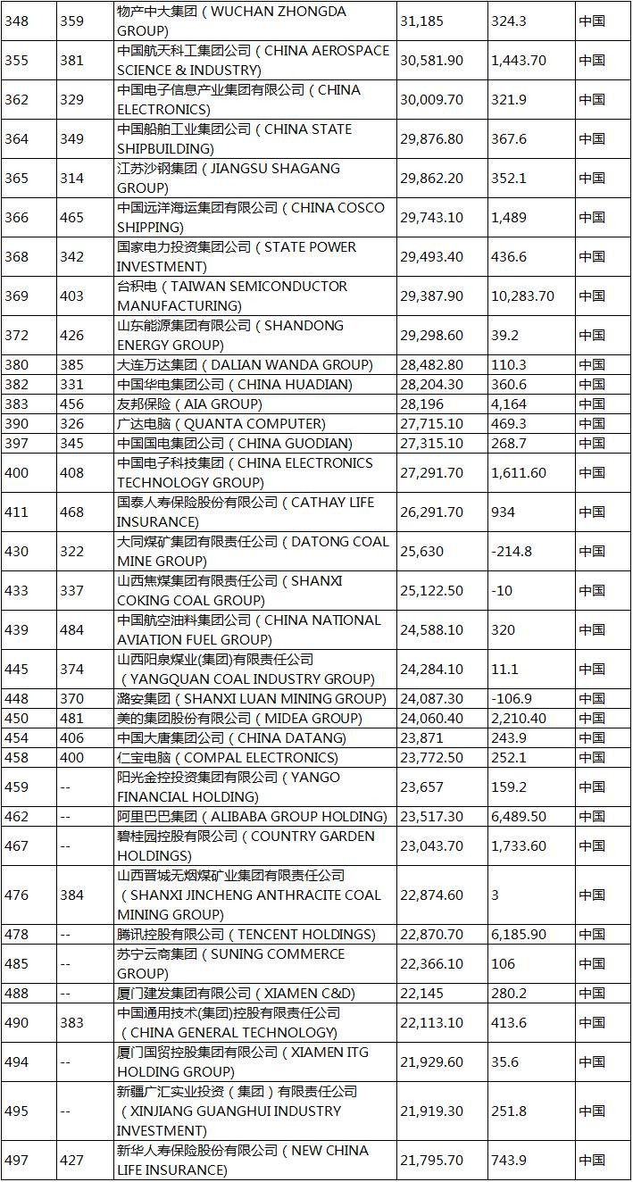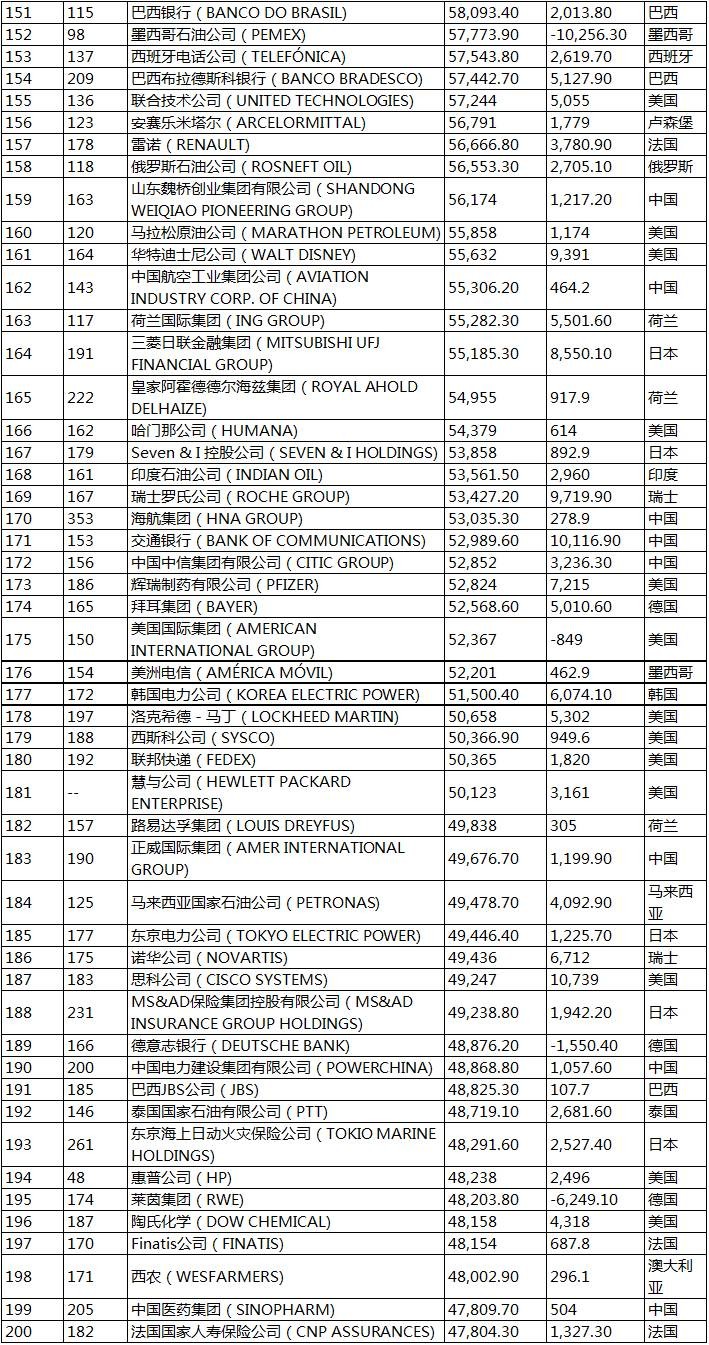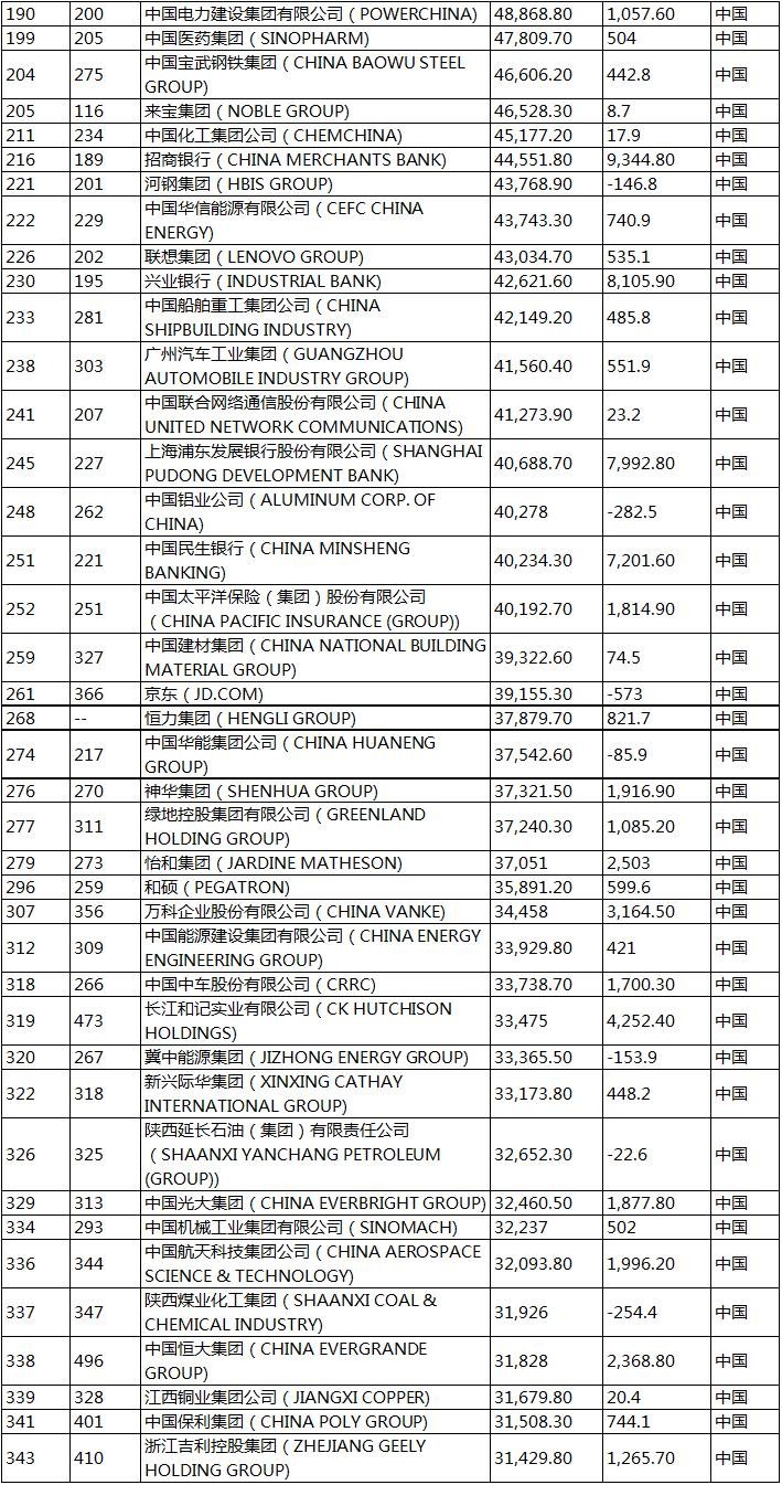 115家上榜的中国企业名单